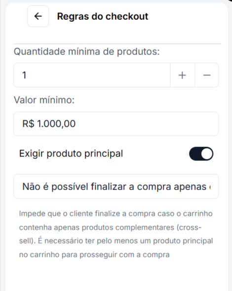Essa regra impede que o cliente finalize a compra caso o carrinho contenha apenas produtos complementares, como itens adicionados via cross-sell.